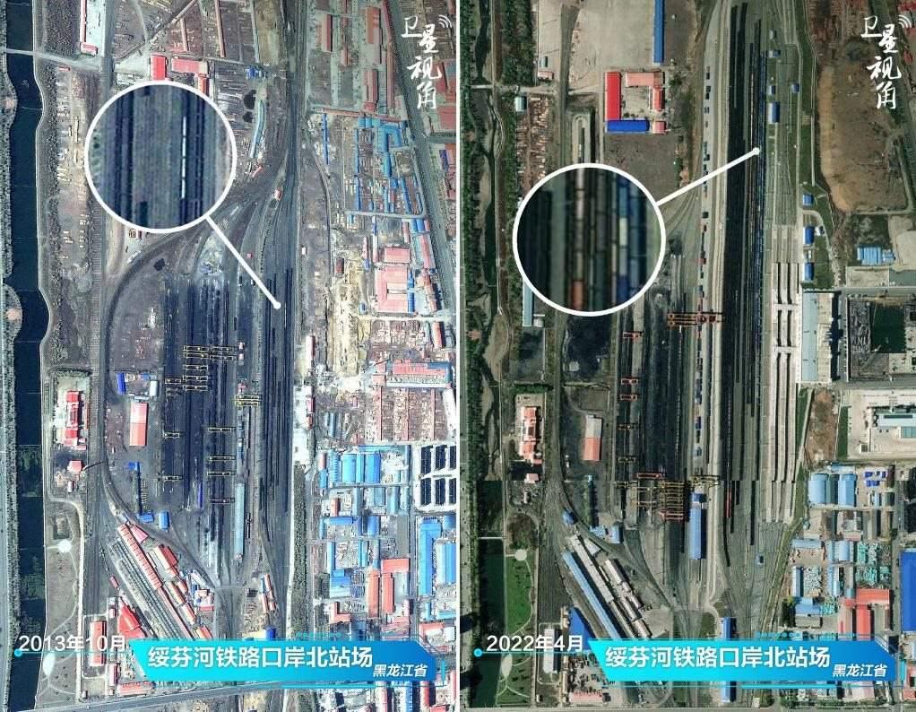 ↑2022年與2013年相比,綏芬河鐵路口岸貨運列車增多,反映外貿(mào)活力增強(qiáng)。