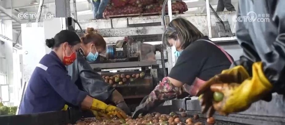 總臺(tái)記者 卜鵬:這里是位于新疆阿克蘇地區(qū)溫宿縣的一處核桃種植基地,這段時(shí)間正是當(dāng)?shù)睾颂页墒觳烧募竟?jié)。這些核桃樹上,一顆顆青綠渾圓的核桃掛滿枝頭,而在核桃樹底下,當(dāng)?shù)氐墓r(nóng)們正在抓緊撿收被抖落的核桃。為什么說(shuō)是被抖落的核桃而不是被敲落的核桃?那是因?yàn)?,在?dāng)?shù)匾恍┓N植面積比較大的核桃基地里,當(dāng)?shù)氐墓r(nóng)會(huì)選擇利用農(nóng)業(yè)機(jī)械輔助抖動(dòng)樹干的方式來(lái)采收核桃。采收的時(shí)候,果農(nóng)們會(huì)把繩索捆綁在核桃樹上,負(fù)責(zé)機(jī)械操作的師傅會(huì)根據(jù)樹枝的粗細(xì)來(lái)掌握和控制抖動(dòng)的力度,這樣就能夠避免因?yàn)橛昧^(guò)猛而對(duì)樹枝產(chǎn)生傷害。經(jīng)過(guò)機(jī)器的搖擺,核桃就會(huì)接二連三落在地上,相比于人工采摘,機(jī)械采摘的方式效率會(huì)更高。