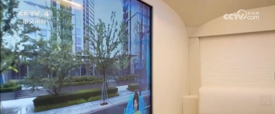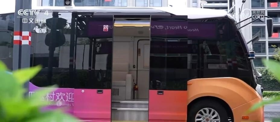 總臺記者 黃珊:亞運村里的AR智能巴士在全自動巡航狀態(tài)下,能為乘客提供接駁、講解的服務。正前方的特殊窗戶結合車載AR功能,透過它能夠看到車外的實時影像,結合虛擬場景,虛實結合,非常奇妙。