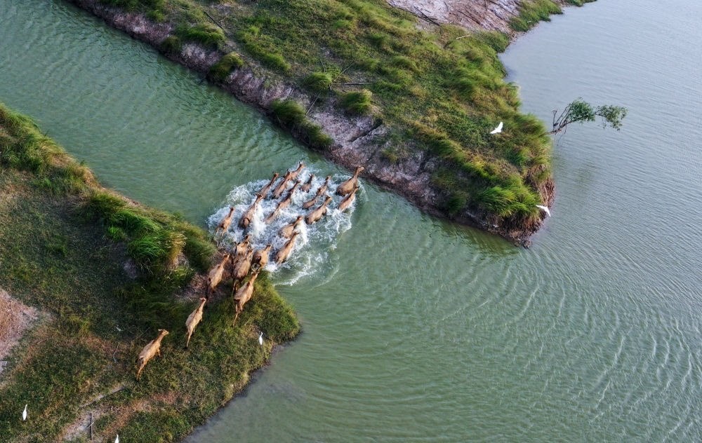 一群麋鹿在江蘇大豐麋鹿國(guó)家級(jí)自然保護(hù)區(qū)野鹿蕩渡河(無(wú)人機(jī)照片,8月20日攝)。