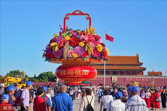 2023年9月22日上午,北京,“祝福祖國(guó)”巨型花籃在天安門廣場(chǎng)亮相。