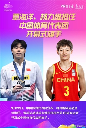 9月22日上午,中國(guó)體育代表團(tuán)宣布,將由游泳運(yùn)動(dòng)員覃海洋、籃球運(yùn)動(dòng)員楊力維擔(dān)任杭州亞運(yùn)會(huì)開(kāi)幕式中國(guó)體育代表團(tuán)旗手。