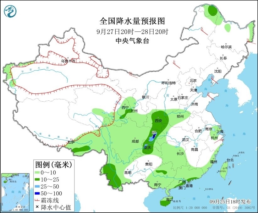 圖1 全國降水量預報圖(9月25日20時-26日20時)
