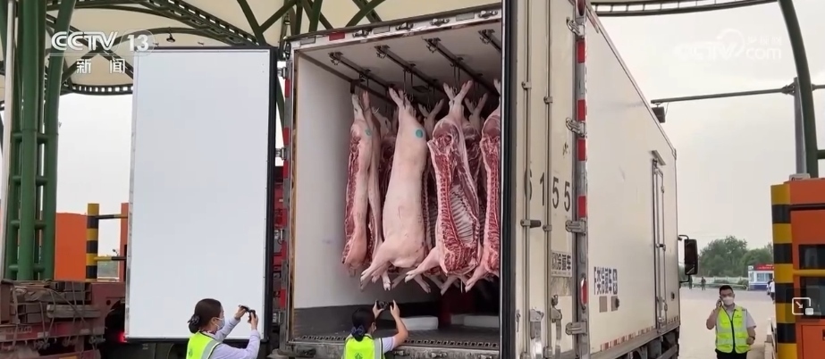 為了保障肉品質量,在這家保供基地生豬屠宰后,會馬上進入預冷車間,預冷2小時之后再轉運到冷鏈車上,運輸全程制冷。另外,當?shù)卣瓦\管部門也同步強化服務,在檢疫、運輸、轉運等多個環(huán)節(jié)提供便利。