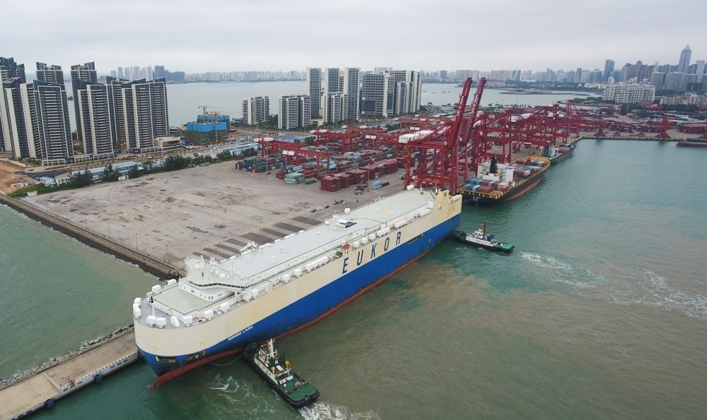 2020年2月16日,滾裝貨船“勞拉”輪駛?cè)牒?谛阌⒏郏o人機(jī)照片)。這是海南自貿(mào)區(qū)政策實施后的首艘汽車外貿(mào)船。新華社記者 楊冠宇 攝
