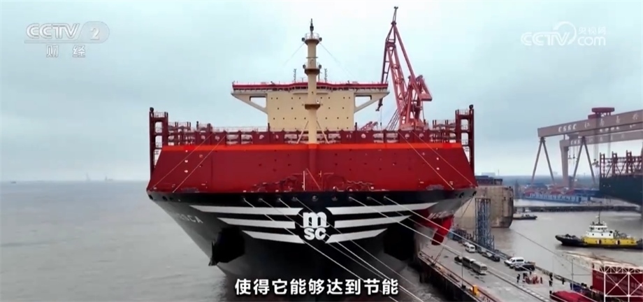 總臺央視記者 孟湛東:我現(xiàn)在是在中國船舶滬東中華造船廠的一艘13000箱的雙燃料集裝箱船上。這艘船除了使用傳統(tǒng)的石油燃料之外,還引入了液化天然氣,可以直接降低28%以上的溫室氣體排放。除此之外,在船頭還有一個獨特的設計,各位可以看到一個綠色的防風罩,工人們親切地稱它“綠頭怪”,這樣的設計可以讓船舶在正常行駛當中降低2%左右的燃料消耗。