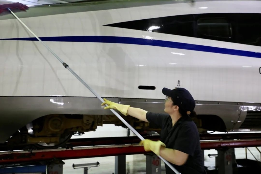 動(dòng)車組經(jīng)過洗車機(jī)時(shí),調(diào)度室內(nèi)調(diào)度員精準(zhǔn)聯(lián)控司機(jī),機(jī)房有專業(yè)的設(shè)備操作人員負(fù)責(zé)監(jiān)控,確保洗車機(jī)正常運(yùn)轉(zhuǎn),外皮清洗到位。在動(dòng)車檢修庫內(nèi),質(zhì)檢員全方位卡控人工清洗環(huán)節(jié),檢查清潔是否到位。