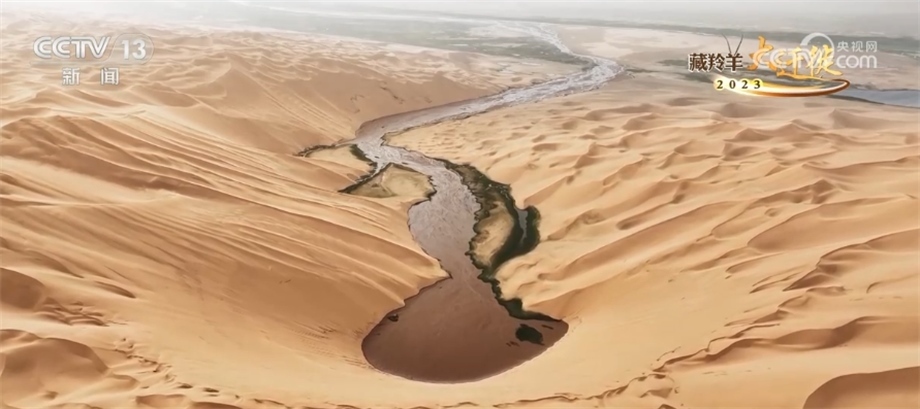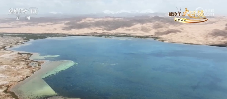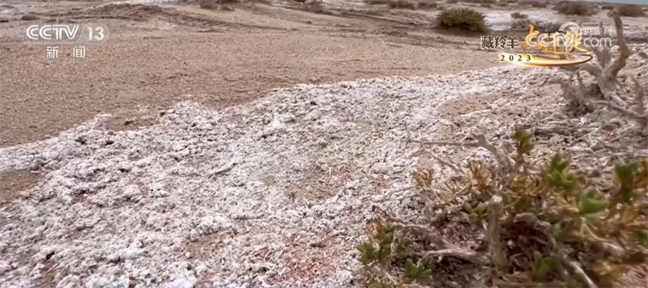 總臺(tái)記者 崔寧:你看這個(gè)鹽堿地長(zhǎng)的是典型的沙漠性植物,然后一路鹽堿,到前面就是浩瀚的阿雅克庫木湖。這是阿爾金山最大的湖泊,這兒的海拔有4300米左右,所以我們?cè)谶@個(gè)鏡頭當(dāng)中就看到特別奇特的景象,植物、鹽堿、鹽花、水、大片大片的湖泊,非常神奇。