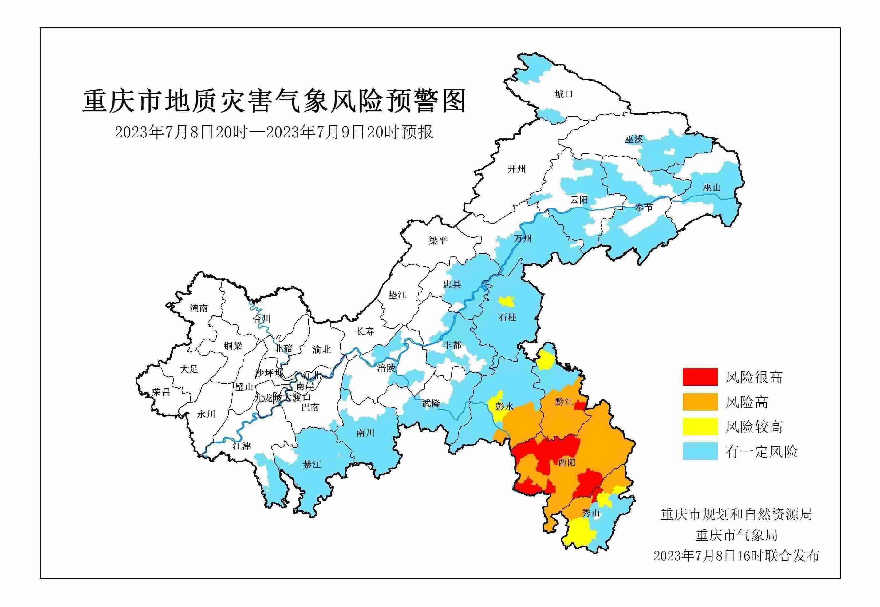 7月8日20時至7月9日20時,酉陽縣、秀山縣、黔江區(qū)屬于風險很高地區(qū),地質(zhì)災害氣象風險等級為I級(紅色預警),彭水縣屬于風險高地區(qū),地質(zhì)災害氣象風險等級為Ⅱ級(橙色預警),石柱縣屬于風險較高地區(qū),地質(zhì)災害氣象風險等級為Ⅲ級(黃色預警),城口縣、萬州區(qū)、云陽縣、巫山縣、巫溪縣、奉節(jié)縣、忠縣、涪陵區(qū)、豐都縣、江津區(qū)、綦江區(qū)、萬盛經(jīng)開區(qū)、南川區(qū)、武隆區(qū)、巴南區(qū)屬于有一定風險地區(qū),地質(zhì)災害氣象風險等級為Ⅳ級(藍色預警)。