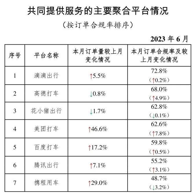 其中,面向乘客、與網(wǎng)約車平臺公司共同提供服務(wù)的平臺(俗稱“聚合平臺”)完成2.18億單,環(huán)比上升4.0%。按訂單合規(guī)率由高到低的分別是滴滴出行、高德打車、花小豬出行、美團打車、百度打車、騰訊出行、攜程用車。