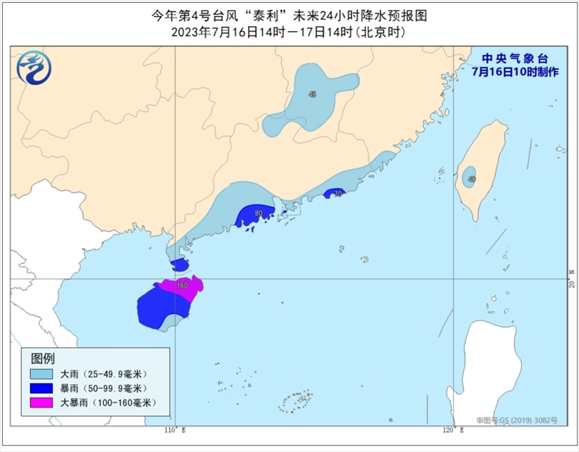 大風預報:7月16日14時至17日14時,南海大部、廣東沿海、北部灣東部、西沙、中沙、南沙及黃巖島附近海面將有6-7級大風,南海中部和北部的部分海域、東沙附近海面風力有8-10級,臺風中心經(jīng)過的海域和島嶼附近風力有11-12級,陣風13-14級。