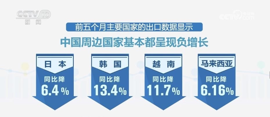 當(dāng)記者查閱主要國家前5個(gè)月的進(jìn)口數(shù)據(jù)時(shí)發(fā)現(xiàn),主要國家進(jìn)口額普遍下降,全球需求不振持續(xù)顯現(xiàn)。而前5個(gè)月主要國家的出口數(shù)據(jù)也顯示,中國周邊國家基本都呈現(xiàn)負(fù)增長,日本同比降6.4%、韓國同比降13.4%、越南同比降11.7%、馬來西亞同比降6.16%。