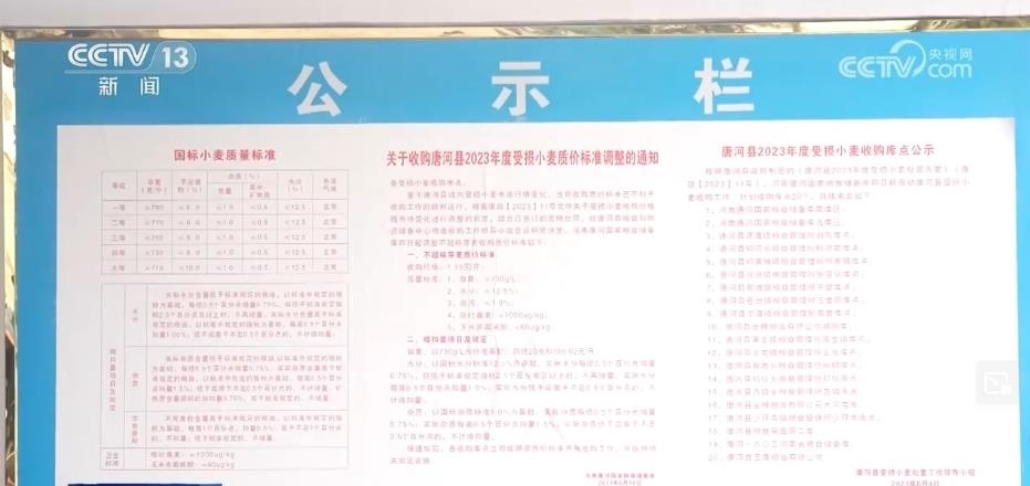 記者在這家糧食儲備庫的公示欄里看到了一份《收購唐河縣受損小麥質(zhì)價標準調(diào)整的通知》,里面明確了受損小麥的收購價格是1.15元每斤,而這個價格只比正常小麥收購價1.4元左右低了0.3元。這張通知的落款日期是6月4日,而當?shù)剞r(nóng)戶普遍是在6月3日收完糧食,這也在第一時間讓老百姓吃下了“定心丸”。