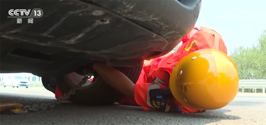 兩人將鐵鏈和拖車鉤工具套在故障車前底盤,但這得鉆進(jìn)車底,貼地操作。中午的高速柏油路面氣溫已經(jīng)逼近60℃,發(fā)燙的路面和陣陣熱浪讓人滿身灼熱感。隨后,兩人通過卷揚(yáng)機(jī)將故障車牽引到救援車上,再逐一固定好故障車的四個輪胎。高溫下在高速露天作業(yè),他倆的頭發(fā)上不斷甩出汗珠。