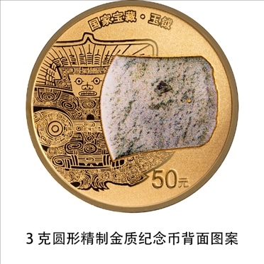 3克圓形金質(zhì)紀(jì)念幣背面圖案為玉鉞造型,襯以良渚文化相關(guān)紋飾,并刊“國家寶藏·玉鉞”字樣及面額。
