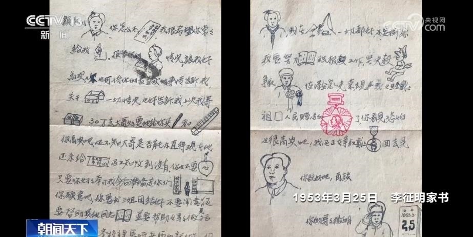 這是一封1953年3月25日從抗美援朝戰(zhàn)場發(fā)往江蘇宿遷的信。在這封戰(zhàn)地家書中,志愿軍戰(zhàn)士李征明為未來的奮斗目標(biāo)做出規(guī)劃。因為妹妹們的年齡還很小、識字不多,李征明擔(dān)心她們看不懂,就在信中畫上了許多圖文并茂的小畫。