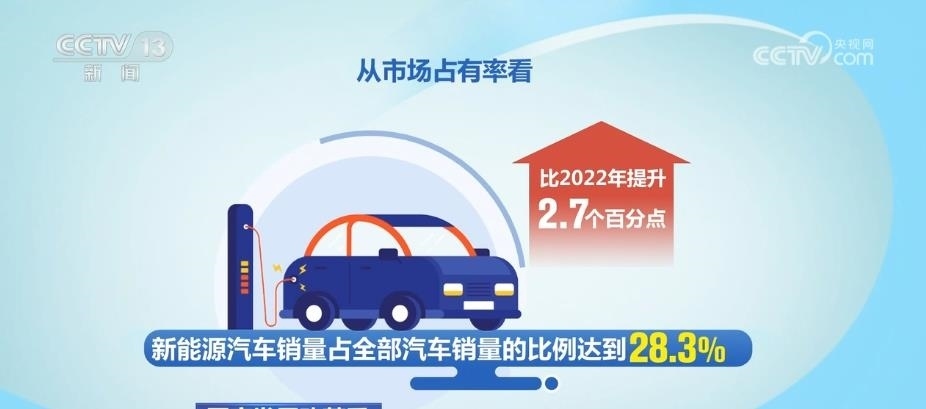 從市場(chǎng)占有率看,新能源汽車銷量占全部汽車銷量的比例達(dá)到28.3%,比2022年提升2.7個(gè)百分點(diǎn)。