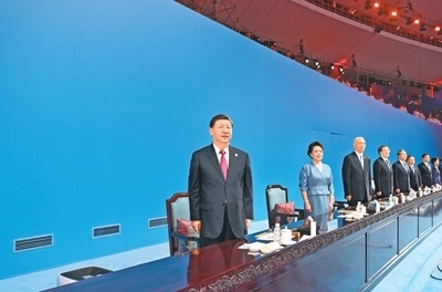 19時58分,在《和平——命運共同體》的樂曲聲中,習近平和夫人彭麗媛,同國際大學生體育聯(lián)合會代理主席艾德等步入主席臺,向觀眾揮手致意。全場響起長時間的熱烈掌聲。