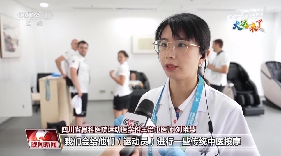 四川省骨科醫(yī)院運動醫(yī)學科主治中醫(yī)師 劉曦慧:我們會給他們(運動員)進行一些傳統(tǒng)中醫(yī)按摩,還有一些特殊的穴位和特殊的治療方法。除此之外,我們還有一些傳統(tǒng)的針灸拔罐,針對性地對他們進行一些治療和預防。