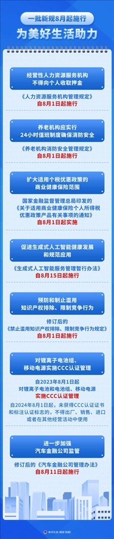 ·一批民生新規(guī)8月開(kāi)始施行。從完善人力資源服務(wù)機(jī)構(gòu)管理,到強(qiáng)化養(yǎng)老機(jī)構(gòu)消防安全;從擴(kuò)大適用個(gè)稅優(yōu)惠政策的商業(yè)健康保險(xiǎn)范圍,到規(guī)范生成式人工智能服務(wù)……法治,為美好生活助力。