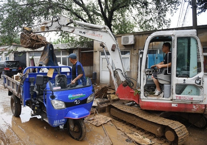 8月1日,在北京市房山區(qū)青龍湖鎮(zhèn)上萬(wàn)村,工作人員清理山洪過(guò)后受災(zāi)道路。新華社記者 張晨霖 攝