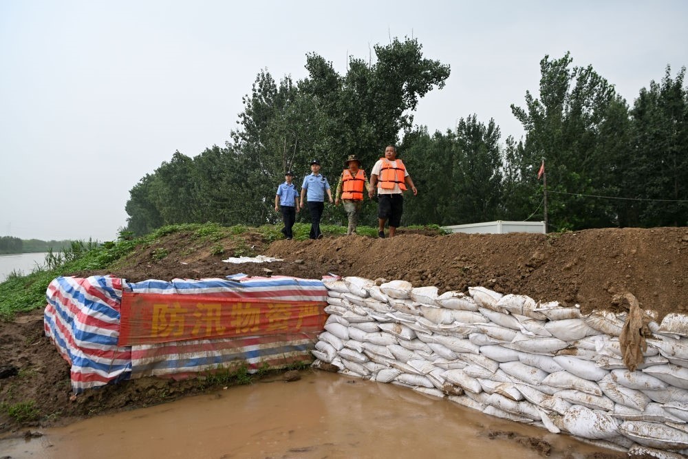 8月1日,在天津市武清區(qū)黃花店鎮(zhèn)邵七堤村,公安人員和村志愿者聯(lián)合在河堤加高處巡查值守。新華社記者 孫凡越 攝