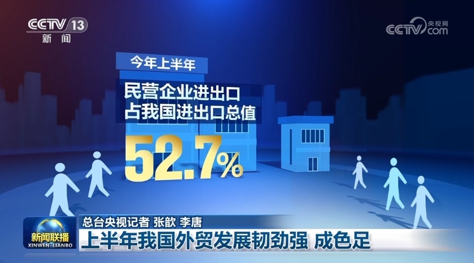 民營企業(yè)正成為我國外貿(mào)發(fā)展的主力軍。今年上半年,民營企業(yè)進出口占我國進出口總值的52.7%,同比提升3.3個百分點。外貿(mào)“新三樣”,即電動汽車、鋰電池、太陽能電池加速出海,合計出口增長61.6%。新業(yè)態(tài)、新模式蓬勃發(fā)展,我國跨境電商主體已超過10萬家。上半年,跨境電商進出口同比增長16%。