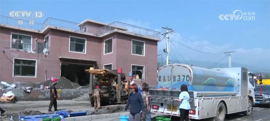 在北京市房山區(qū)西班各莊村,由于洪水侵襲,當(dāng)?shù)厮淳粵_毀,230戶村民出現(xiàn)飲水困難。當(dāng)?shù)厮块T立即派出應(yīng)急送水車,同時集結(jié)勘探隊(duì)、機(jī)械設(shè)備,用最快的速度更新水源。?