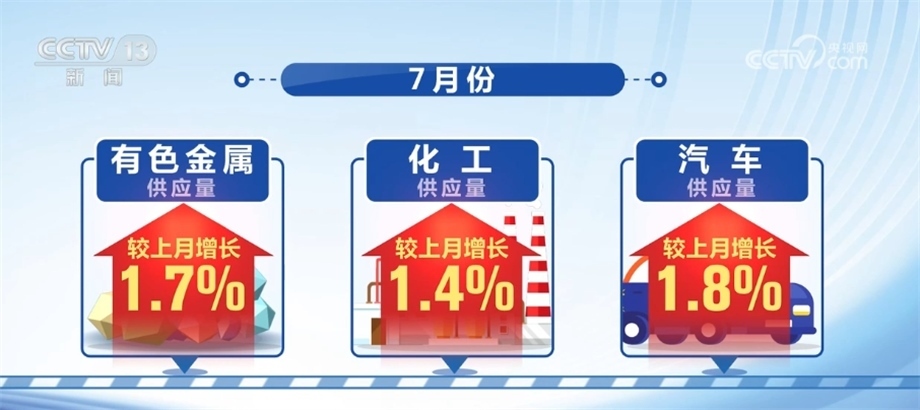 7月份,鋼鐵、煤炭和成品油供應(yīng)量較上月分別增加4.6%、7.3%和4.1%,增速較上月分別加快1.4、1.1和1.3個(gè)百分點(diǎn)。有色金屬、化工和汽車(chē)供應(yīng)量較上月分別增長(zhǎng)1.7%、1.4%和1.8%。
