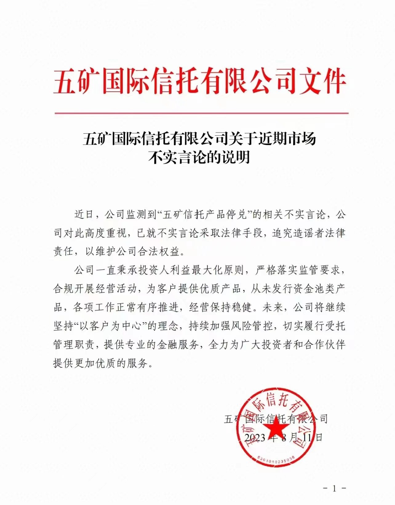 五礦國際信托有限公司(下稱“五礦信托”)發(fā)布聲明稱,近日,公司監(jiān)測到“五礦信托產品停兌”的相關不實言論,公司對此高度重視,已就不實言論采取法律手段,追究造謠者法律責任,以維護公司合法權益。公司一直秉承投資人利益最大化原則,嚴格落實監(jiān)管要求,合規(guī)開展經營活動,為客戶提供優(yōu)質產品,從未發(fā)行資金池類產品,各項工作正常有序推進,經營保持穩(wěn)健。