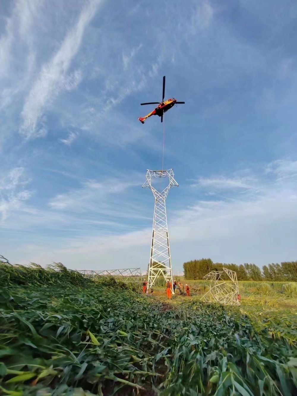 9日,在海林市110千伏長(zhǎng)海輸電線路搶修現(xiàn)場(chǎng),一架直升機(jī)吊裝起沉重的輸電鐵塔,運(yùn)送到指定地點(diǎn)。這個(gè)輸電鐵塔處于河流中心島位置,無(wú)法使用常規(guī)起重設(shè)備。國(guó)家電網(wǎng)公司迅速?gòu)膰?guó)網(wǎng)遼寧電力、國(guó)網(wǎng)空間技術(shù)公司等單位調(diào)配直升機(jī)支援黑龍江,解決輸電鐵塔吊裝、運(yùn)輸?shù)葐?wèn)題。