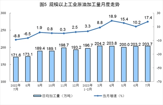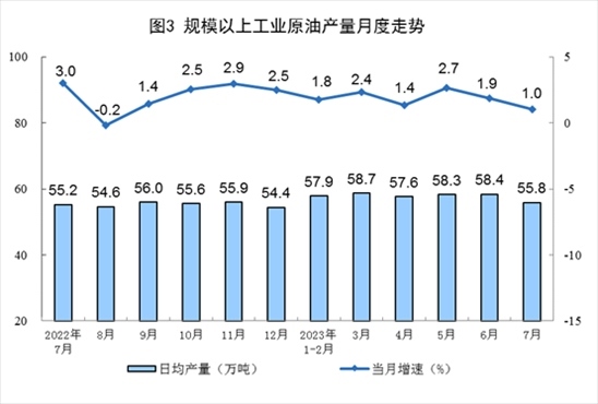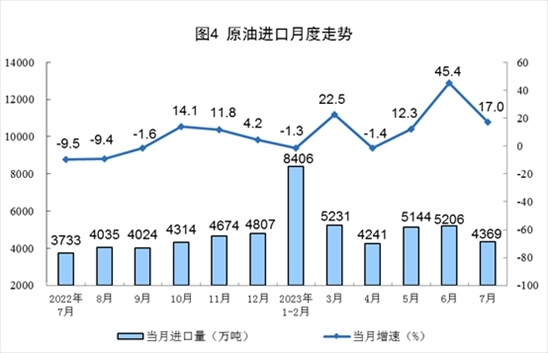 原油產(chǎn)量小幅增加,進(jìn)口保持較快增長。7月份,生產(chǎn)原油1731萬噸,同比增長1.0%,增速比6月份放緩0.9個(gè)百分點(diǎn),日均產(chǎn)量55.8萬噸。進(jìn)口原油4369萬噸,同比增長17.0%,增速比6月份回落28.4個(gè)百分點(diǎn)。