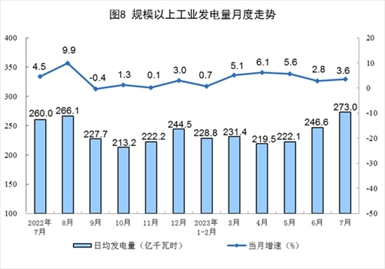 電力生產(chǎn)有所加快。7月份,發(fā)電量8462億千瓦時(shí),同比增長3.6%,增速比6月份加快0.8個(gè)百分點(diǎn),日均發(fā)電273.0億千瓦時(shí)。1—7月份,發(fā)電量50130億千瓦時(shí),同比增長3.8%。