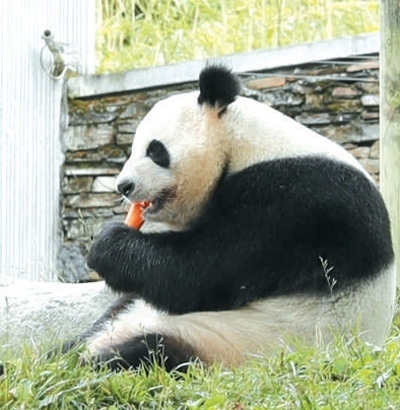 中國臥龍大熊貓繁育中心里的大熊貓在進食。 孫信志攝
