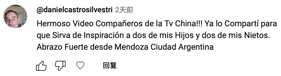 網(wǎng)友danielcastrosilvestri:“中國電視臺(tái)的朋友們,這個(gè)視頻太好看了?。?!我把它分享出去,希望它能夠給我的兩個(gè)孩子和兩個(gè)孫子帶來啟發(fā)。我來自阿根廷的門多薩市,致禮?!?/p>