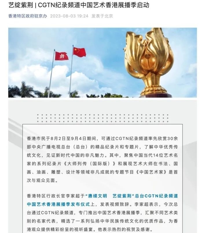 香港特區(qū)政府駐京辦刊文推介中國藝術(shù)香港展播季