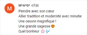 法語網(wǎng)友M*A*G*:“用心作畫,將傳統(tǒng)與現(xiàn)代結(jié)合,華麗的作品,偉大的智慧,這是多么幸福的一件事?。 ?/p>