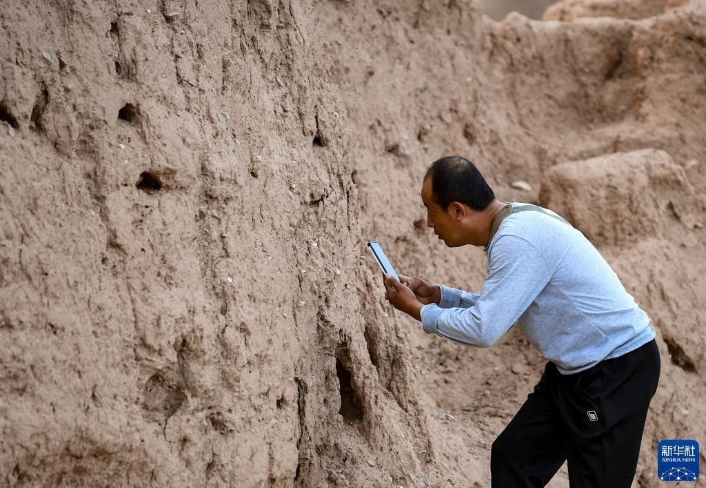 8月20日,董海寧巡查賀蘭山沿線(xiàn)的明長(zhǎng)城永寧段時(shí)用手機(jī)拍照記錄。新華社記者 連振 攝