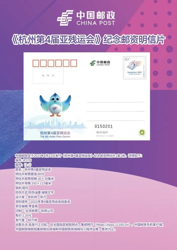 今天,中國郵政還發(fā)行了《杭州第4屆亞殘運(yùn)會》紀(jì)念郵資明信片一套1枚,編號為JP276。郵資圖為杭州亞殘運(yùn)會會徽,主體表現(xiàn)杭州亞殘運(yùn)會名稱和吉祥物飛飛,襯以杭州城市剪影,體現(xiàn)“兩個亞運(yùn),同樣精彩”的辦賽理念,激勵殘疾人運(yùn)動員在競技舞臺上,展現(xiàn)勇于挑戰(zhàn)、戰(zhàn)勝自我、創(chuàng)造幸福的良好精神風(fēng)貌。