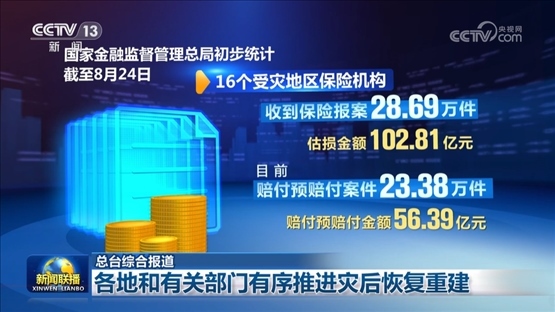 國家金融監(jiān)督管理總局初步統(tǒng)計(jì),截至8月24日,16個(gè)受災(zāi)地區(qū)保險(xiǎn)機(jī)構(gòu)收到保險(xiǎn)報(bào)案28.69萬件,估損金額102.81億元。目前賠付預(yù)賠付案件23.38萬件,賠付預(yù)賠付金額56.39億元。