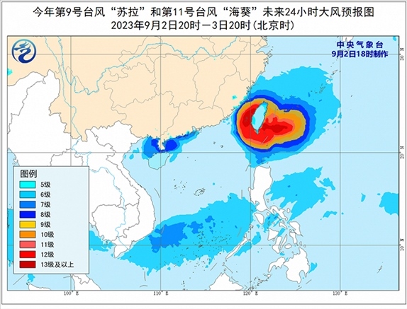 大風(fēng)預(yù)報(bào):9月2日20時(shí)至3日20時(shí),受“蘇拉”影響,廣東中西部沿海、廣西南部沿海、海南島北部沿海、珠江口及澳門等地將有6-7級(jí)大風(fēng),南海西北部、北部灣東部和瓊州海峽將有8級(jí)、陣風(fēng)9-10級(jí)的大風(fēng);受“??庇绊?,巴士海峽南部、臺(tái)灣海峽西部、東海南部及釣魚島附近海域、浙江南部沿海、福建中北部沿海、臺(tái)灣島沿海將有6-8級(jí)、陣風(fēng)9-10級(jí)大風(fēng),巴士海峽北部、臺(tái)灣海峽東部、臺(tái)灣以東洋面及臺(tái)灣島南部沿海的風(fēng)力有9-12級(jí),陣風(fēng)13-14級(jí),“??敝行慕?jīng)過的附近海面或地區(qū)的風(fēng)力有13-16級(jí),陣風(fēng)17級(jí)。