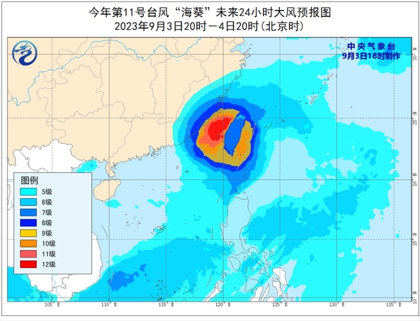 大風(fēng)預(yù)報(bào):9月3日20時(shí)至4日20時(shí),巴士海峽、臺(tái)灣海峽、臺(tái)灣以東洋面、東海南部及釣魚島附近海域、南海東北部以及浙江南部沿海、福建沿海、廣東東部偏東地區(qū)沿海、臺(tái)灣島及沿海將有6-8級(jí)、陣風(fēng)9-10級(jí)大風(fēng),部分海域或地區(qū)的風(fēng)力有9-12級(jí),陣風(fēng)13-14級(jí),“海葵”中心經(jīng)過的附近海面或地區(qū)的風(fēng)力有13-14級(jí),陣風(fēng)15級(jí)。