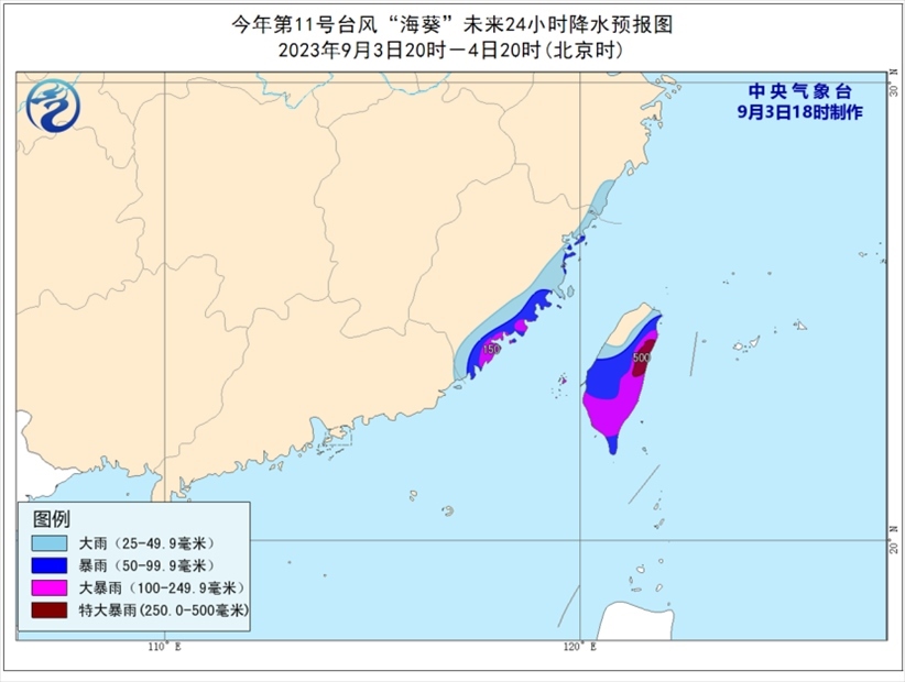 降水預(yù)報(bào):9月3日20時(shí)至4日20時(shí),福建東部、浙江東南部沿海、臺(tái)灣島等地有大到暴雨,其中,福建東南部沿海、臺(tái)灣島東部和南部等地部分地區(qū)有大暴雨,臺(tái)灣島東部局地特大暴雨(250~500毫米);上述地區(qū)最大小時(shí)降雨量20~50毫米,局地可超過60毫米,局地還有雷暴大風(fēng)等強(qiáng)對(duì)流天氣。