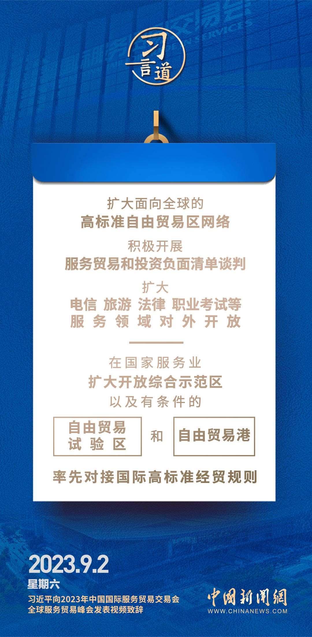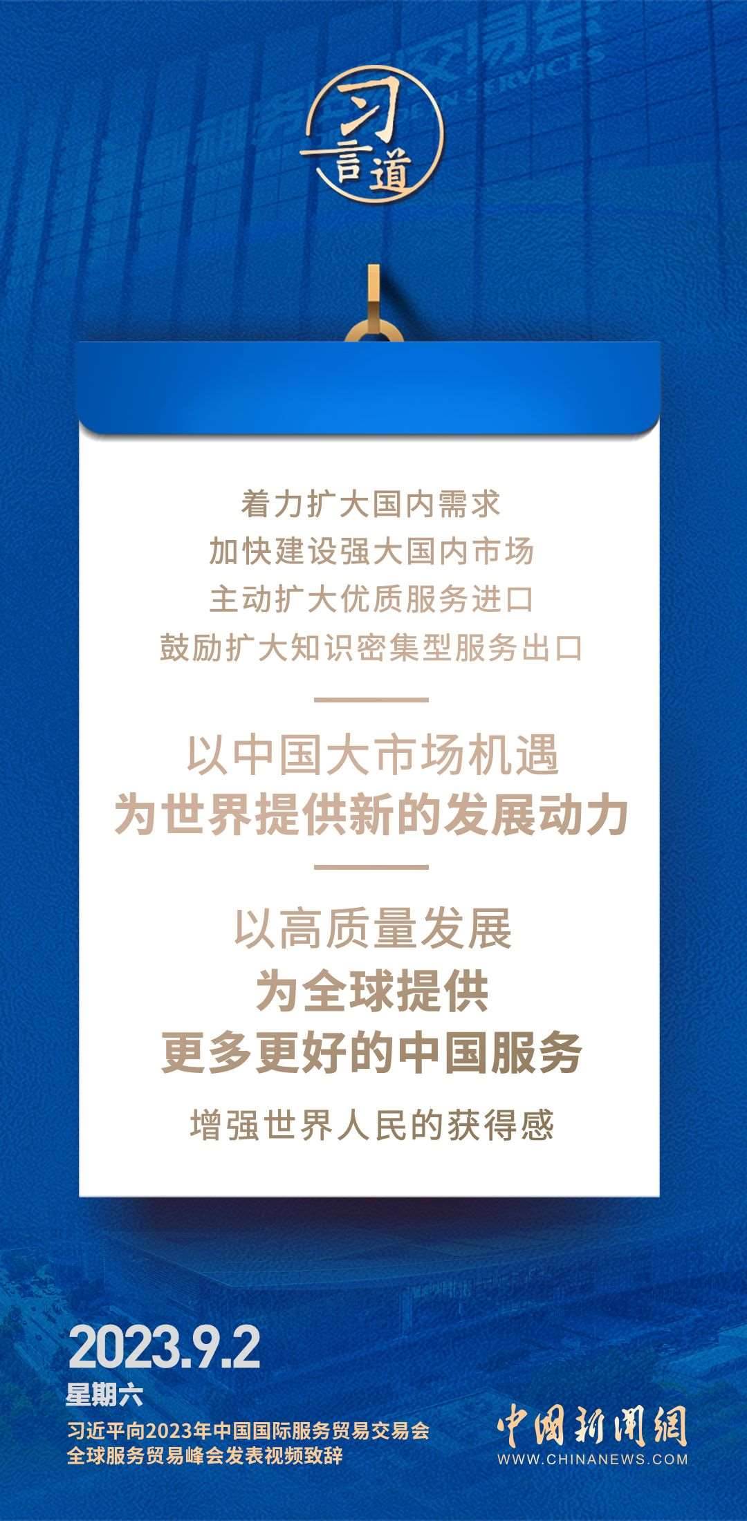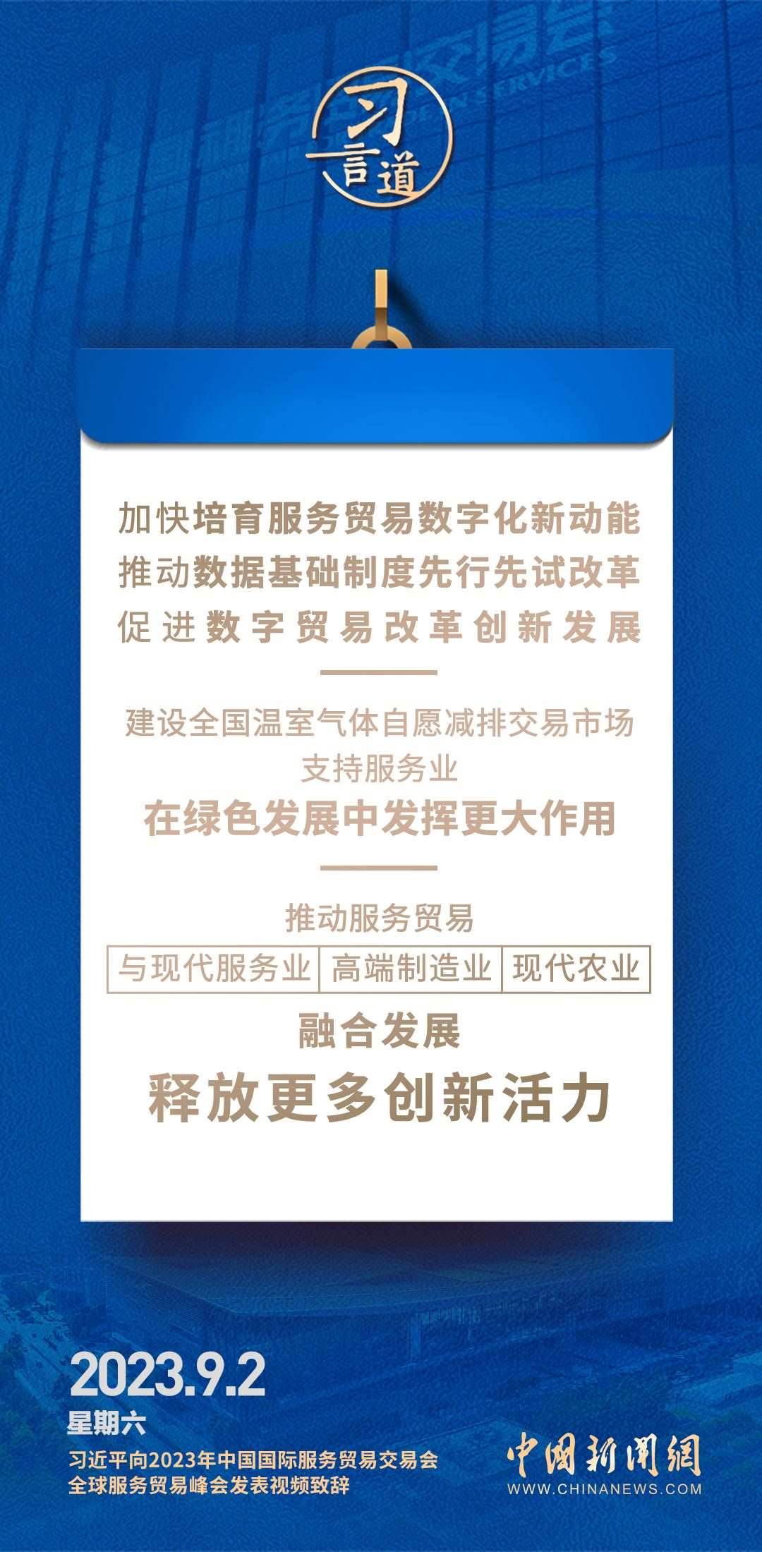 9月2日上午,國家主席習(xí)近平在北京向2023年中國國際服務(wù)貿(mào)易交易會全球服務(wù)貿(mào)易峰會發(fā)表視頻致辭。習(xí)近平指出——