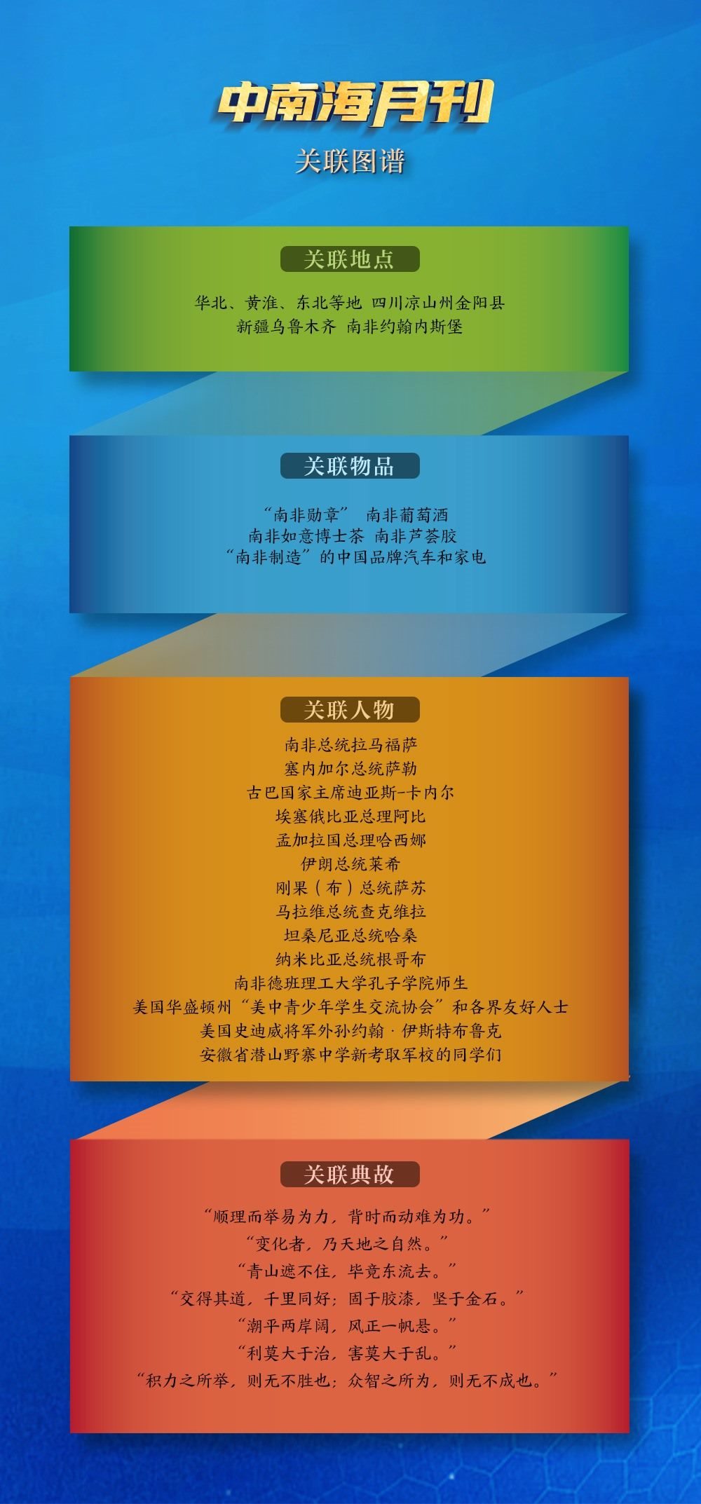 關(guān)聯(lián)物品“南非勛章”吸引了世界目光。8月22日,在南非比勒陀利亞總統(tǒng)府,拉馬福薩總統(tǒng)捧起一枚“南非勛章”,鄭重為習(xí)近平主席佩戴上。這是南非授予重要友好國家元首的最高級(jí)別勛章和最高榮譽(yù),也成為兩國“同志加兄弟”特殊友好關(guān)系的有力見證。
