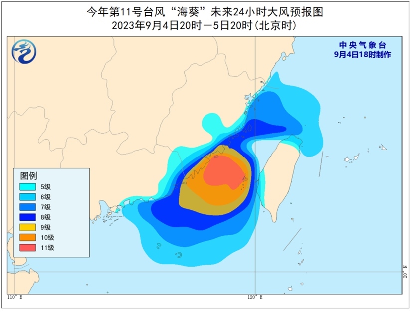 央視網(wǎng)消息:中央氣象臺(tái)9月4日18時(shí)繼續(xù)發(fā)布臺(tái)風(fēng)黃色預(yù)警,今年第11號(hào)臺(tái)風(fēng)“??保℉AIKUI)(強(qiáng)熱帶風(fēng)暴級(jí))的中心今天(4日)下午5點(diǎn)鐘位于閩粵交界偏東方向約200公里的臺(tái)灣海峽南部海面上,就是北緯23.3度、東經(jīng)119.1度,中心附近最大風(fēng)力有11級(jí)(30米/秒),中心最低氣壓為980百帕,七級(jí)風(fēng)圈半徑200-300公里;十級(jí)風(fēng)圈半徑20-30公里。