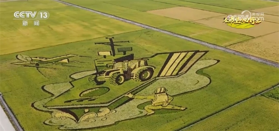 總臺(tái)央視記者 蔣樹林:金秋9月的稻田是什么顏色的?9月的稻香又是什么味道?來(lái)這里,有可能會(huì)找到您想要的答案。我現(xiàn)在是在黑龍江北大荒閆家崗農(nóng)場(chǎng)。大家來(lái)看,這個(gè)稻田觀景臺(tái)有十多米高,因此站在這里,秋日稻田大片的圖案映入眼簾,今年稻田畫以“鄉(xiāng)村振興”“數(shù)字農(nóng)業(yè)”為主題,生動(dòng)展現(xiàn)了“讓農(nóng)業(yè)更美好、讓農(nóng)民更幸?!钡拿篮迷妇啊5咎锂嬍寝r(nóng)民們勤勞與智慧的展現(xiàn),他們用稻田畫為家鄉(xiāng)水稻代言,而對(duì)于在黑土地打拼的北大荒人而言,還有更重要的意義。
