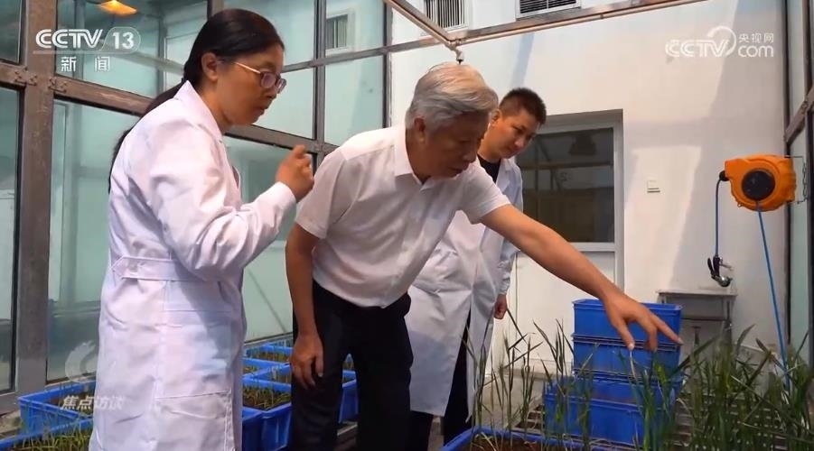 在河南省農(nóng)業(yè)科學院的玻璃溫室,50株剛剛破土一個月的小麥新品種幼苗長勢不錯。小麥品種的培育者——小麥育種專家許為鋼院士帶著團隊細心地查看這些幼苗。