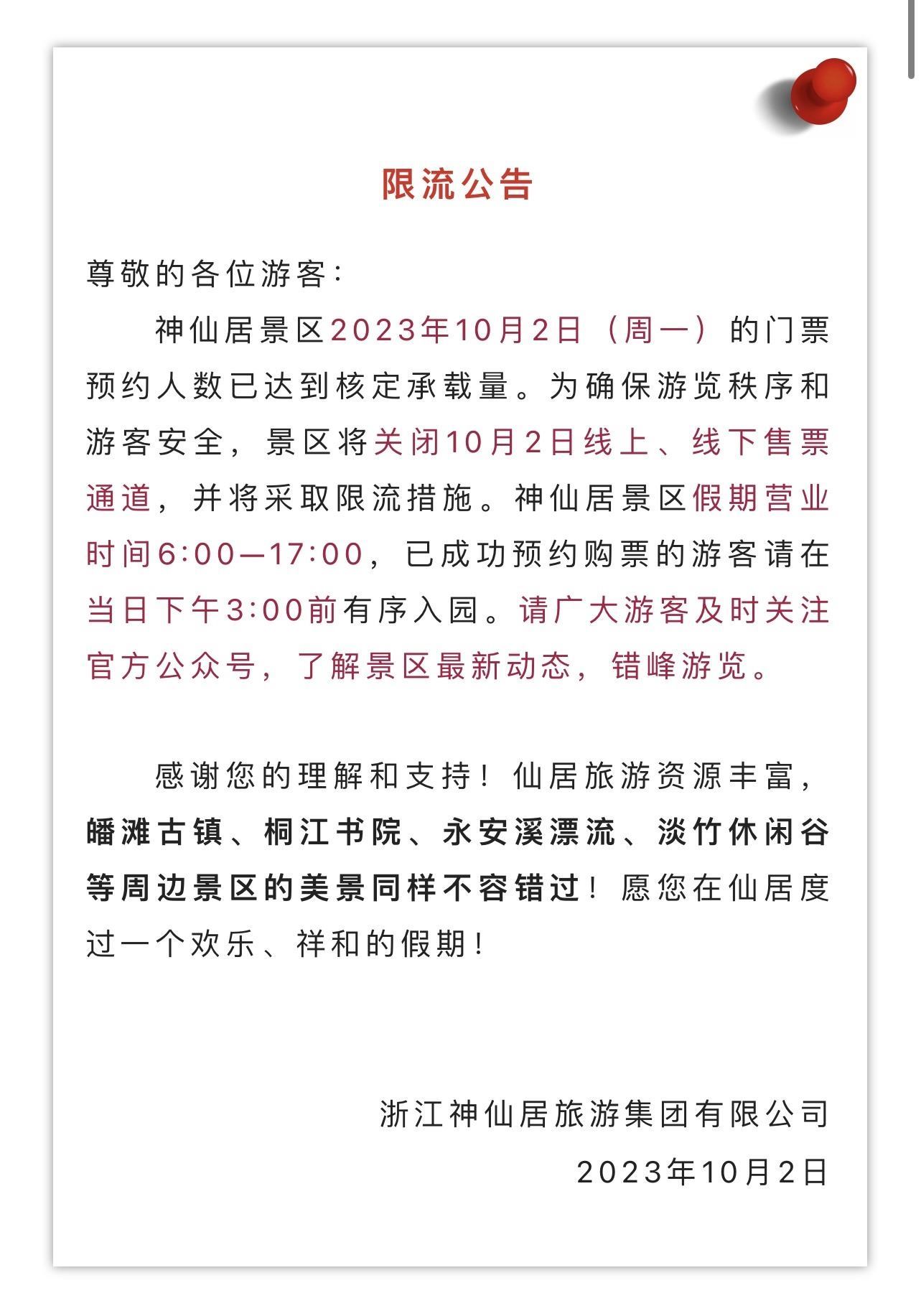 臺州神仙居景區(qū)于10月2日零點就發(fā)布當(dāng)日門票已約滿的消息。