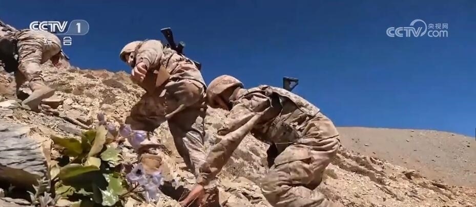 一路走走停停艱難前行。巡邏車行駛至距離點(diǎn)位6公里處停了下來(lái),由于道路塌陷,官兵們只好下車改為徒步巡邏。行走在坡度近70度的陡峭山路上,路面全是碎石,加上海拔不斷攀升,這對(duì)巡邏官兵的體能是極大的挑戰(zhàn)。經(jīng)過(guò)近4個(gè)小時(shí)的艱難攀爬,巡邏分隊(duì)終于到達(dá)了點(diǎn)位。